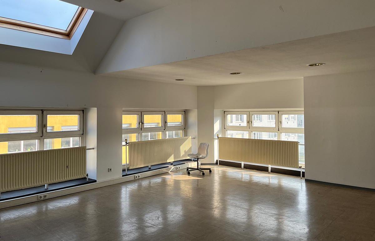 Vorbei an einem Gemeinschaftsraum mit Küche und zwei Ateliers im Erdgeschoss, schließt das helle Stiegenhaus an, das zum Theatersaal im ersten Stock und weiteren Atelierflächen darüber führt. Insgesamt entstehen sieben Ateliers, in denen 13 Künstler:innen Platz zum Arbeiten haben. Außerdem gibt es einen Theatersaal. Der vom Jugendzentrum als Bewegungsraum genutzte Raum im zweiten Stock wird zur geteilten Atelierfläche. Die hohen Decken und Oberlichten lassen eine vielseitige Raumaufteilung durch den Einbau einer Hochebene zu. Auch die Dachgeschossfläche darüber wird in einzelne Ateliers unterteilt.