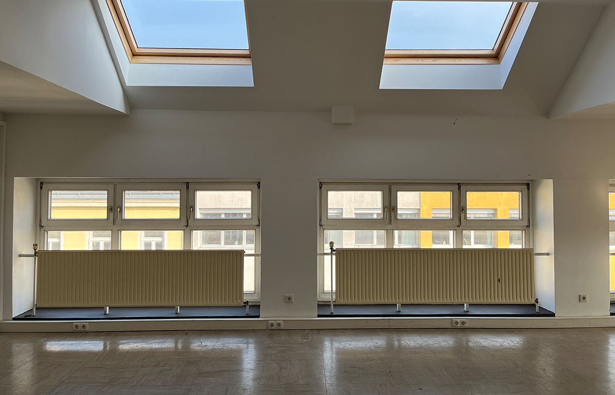 Die sehr hoch positionierten und direkt an der Kante zur Raumdecke anschließenden Fensterreihen wirken auf den ersten Blick ungewöhnlich. Sie weisen auf die ursprüngliche Nutzung des Gebäudes als Brause- und Wannenbad hin: Gebaut in den 1930er Jahren schloss das Gebäude in der Aichholzgasse 52 an eine ehemalige Zentralwäscherei an. Gemeinsam sollten die beiden “Waschanstalten” den Bewohner:innen aus den umliegenden Gemeindebauten die Hygiene erleichtern.