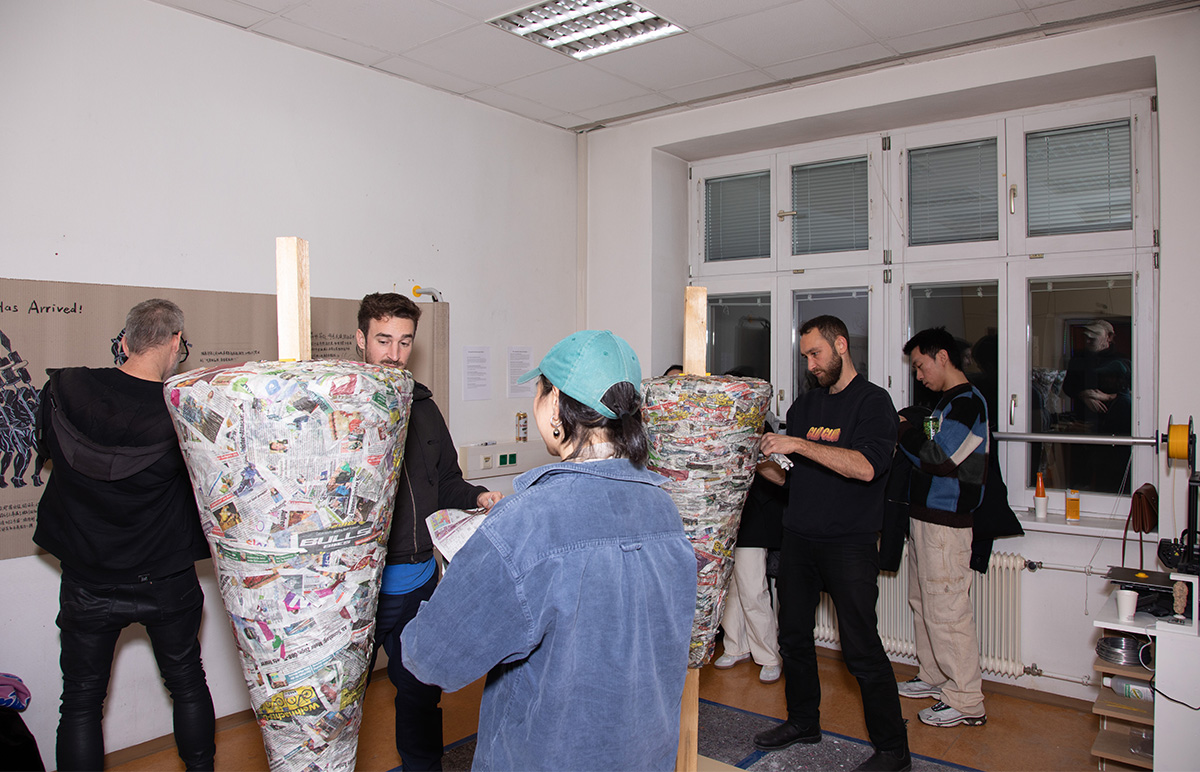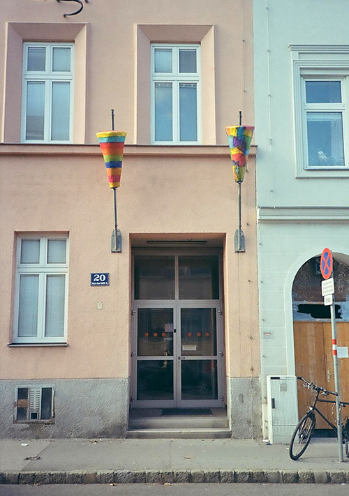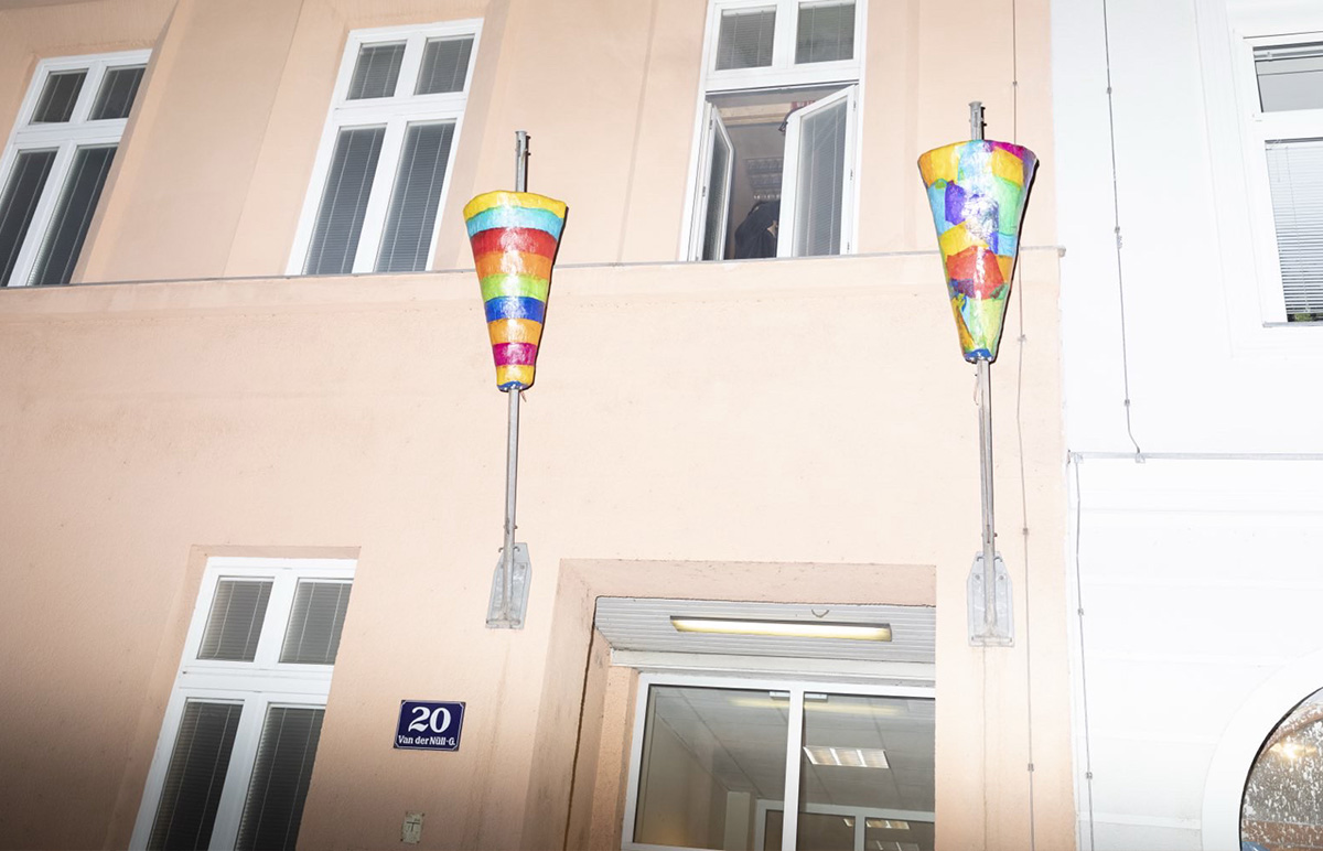 Das von Künstler:innen betriebene Atelierhaus im 10. Bezirk, gegenüber der Polizeiinspektion Favoriten war einst ein Standort der MA11 – Kinder- und Jugendhilfe. Heute wird das Gebäude in einer von Kreative Räume Wien initiierten Zwischennutzung belebt. Künstler:innen und Wissenschaftler:innen arbeiten hier Seite an Seite und verwandeln den Ort in ein temporäres Geflecht von Produktion, Austausch und gemeinsamer Vorstellungskraft. Statt den offiziellen Fahnen der Stadt schmücken jetzt bunte Kebabspieße die Fahnenstangen an der Fassade – ein eindeutiger Hinweis auf die künstlerischen Aktivitäten in diesem Gebäude.