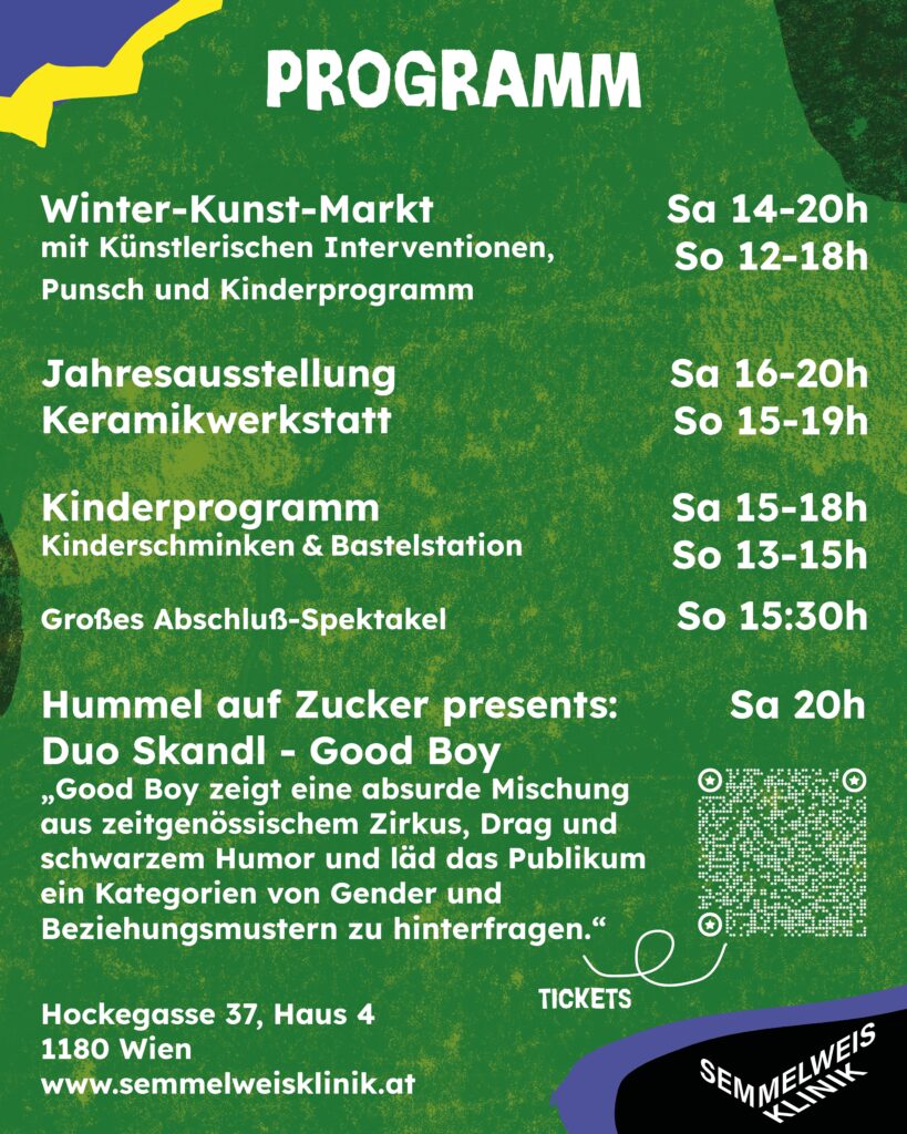 Am zweiten Dezemberwochenende lädt der Kunst- und Kulturverein Semmelweisklinik samstags und sonntags zu ‘Wintervaganza’. Bei Punsch und Keksen wird die ehemalige Großküche der ehemaligen Klinik zum Winter-Kunstmarkt mit über 30 Aussteller:innen. Für Kinder gibt es tagsüber eine Bastelstation und Kinderschminken – und im Hybridraum zeigt das Keramikstudio eine große Ausstellung mit Werken, die in diesem Jahr entstanden sind. Am Samstag gibt es zudem ein Abendprogramm mit einer Mischung aus zeitgenössischem Zirkus, Drag und schwarzem Humor.